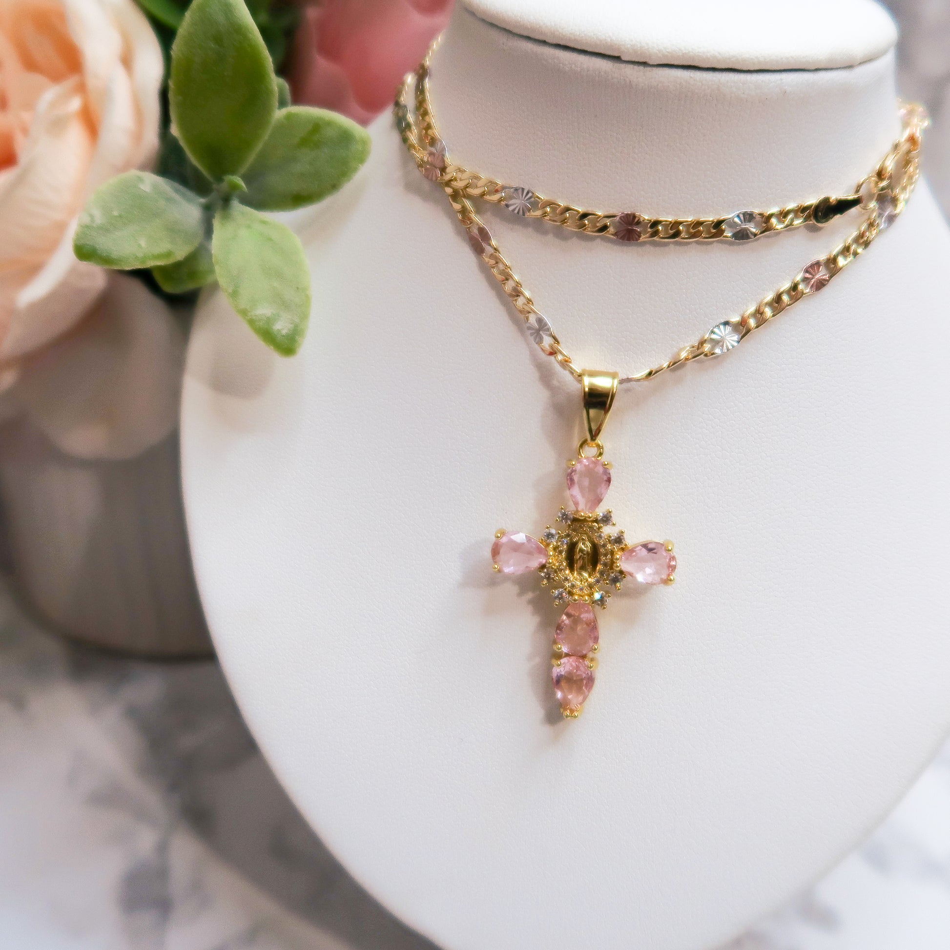 Elegant tri-color necklace featuring a 14k gold plated chain and a delicate Virgen de Guadalupe pink cross pendant. This piece blends spiritual symbolism with stylish design, perfect for daily wear or special occasions. Its durable plating ensures lasting shine while highlighting meaningful devotion.